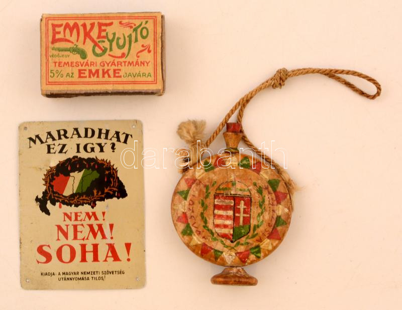 Beschreibung: cca 1925-1940 Maradhat ez így? Nem, nem, soha! Irredenta fémtábla, Magyar Nemzeti Szövetség + Kolozsvár visszatért fa emléktárgy + EMKE gyújtó