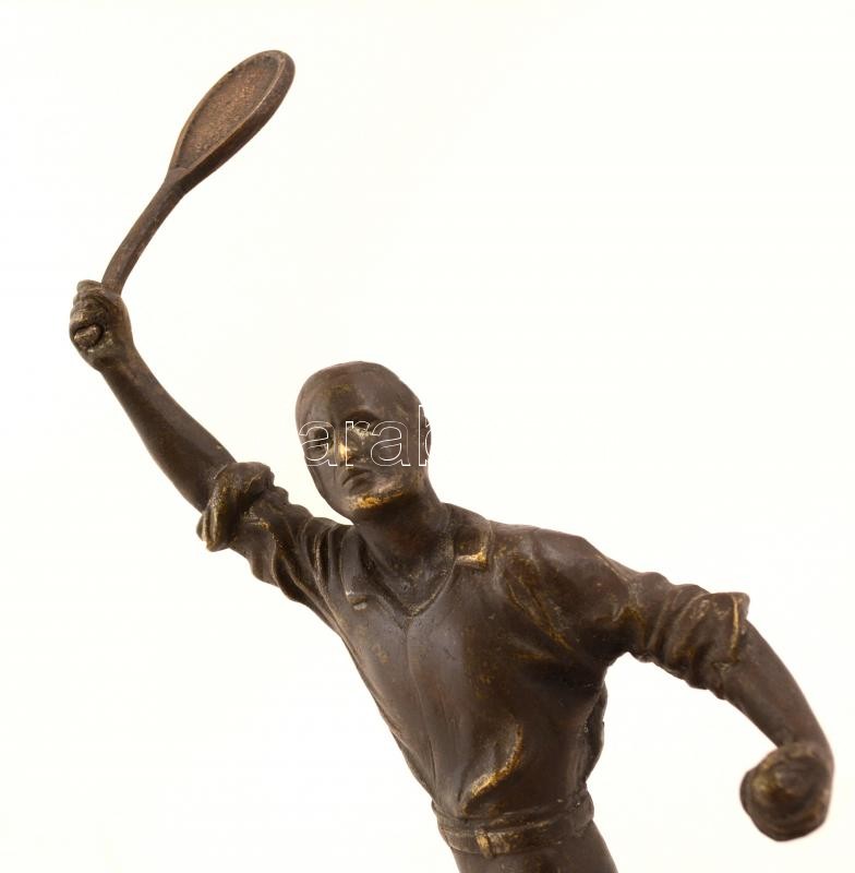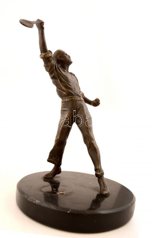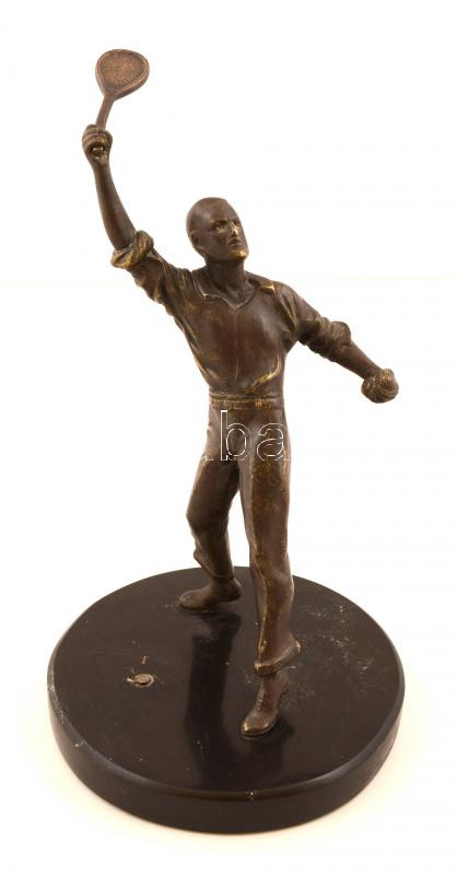 Beschreibung: Jelzés nélkül: Teniszező férfi. Spiáter, ragasztott ütővel, alabástrom talapzattal, m:25 cm