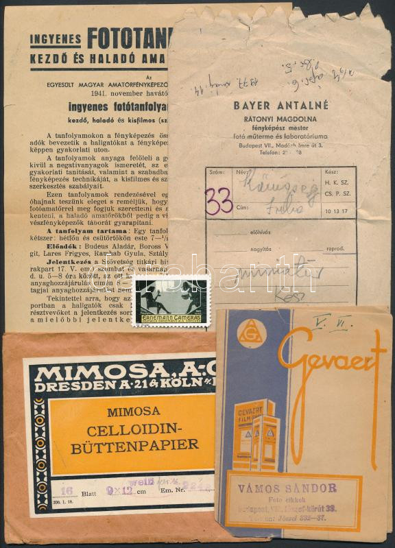 Beschreibung: Fotózással kapcsolatos szórólapok, borítékok, levélzáró(Gevaert, Mimosa, Ernemann Cameras, stb.), 5 db
