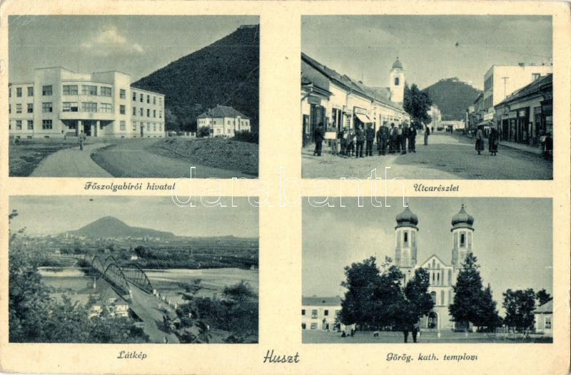 Beschreibung: Huszt, Chust; Főszolgabírói hivatal, utcarészlet, látkép, görög katolikus templom / chief constable's office, street, church (EK)