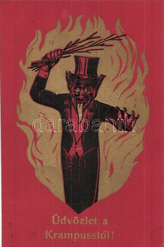 'Üdvözlet a Krampusstól!' / Krampus, golden Emb. (EK) https://www.darabanth.com/de/281-Fernauktion/281.0/Ansichtskarten/Krampus~200086/Udvozlet-a-Krampusstol-Krampus-golden-Emb-EK~II1446760