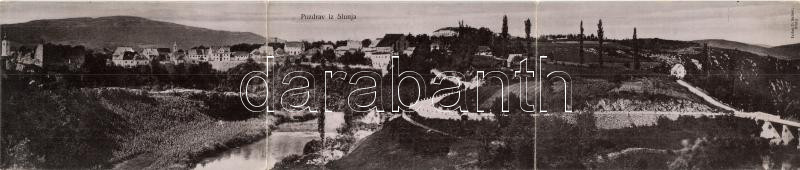 Beschreibung: Szluin, Slunj; 'Pozdrav iz Slunja', látkép, Slunjcica folyó, hegyek, 3 részes kihajtható panorámalap / general view, river, mountains 3-tiled panorama postcard (hajtásnál szakadt / bent til broken)