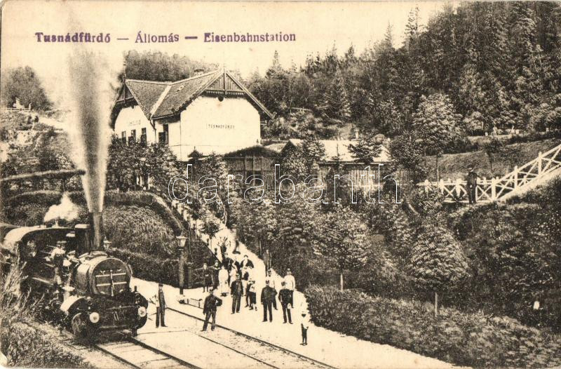 Beschreibung: Tusnádfürdő, Baile Tusnad; vasútállomás, gőzmozdony, Adler és fia / railway station, locomotive