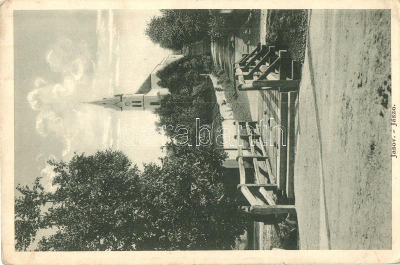 Beschreibung: Jászó, Jasov; templom a hídtól / church, bridge (ázott sarok / wet corner)