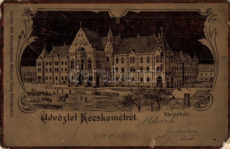 Beschreibung: Kecskemét, színház, kiadja Gallia féle könyvkereskedés Metzger Béla, Art Nouveau metallic card (Rb)