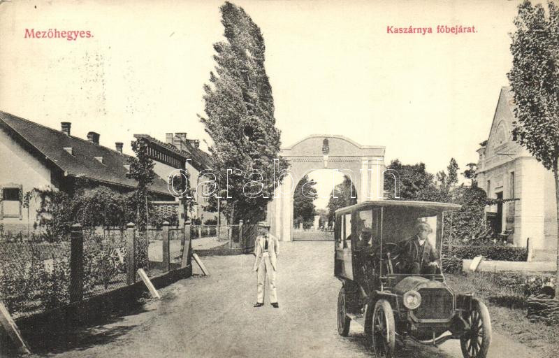Mezőhegyes, kaszárnya főbejárata, automobil https://www.darabanth.com/de/281-Fernauktion/281.0/Ansichtskarten/Ungarn~200006/Mezohegyes-kaszarnya-fobejarata-automobil~II1387464