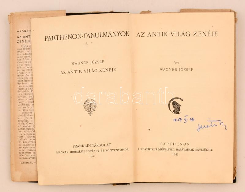 Wagner József: Az antik világ zenéje. Parthenon-Tanulmányok. Budapest, 1943, Parthenon-Franklin Társulat. Kiadói egészvászon kötés, kiadói szakadozott papírborítóban.
