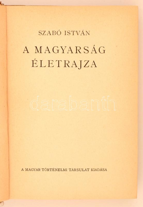 Szabó István: A magyarság életrajza. Magyar Történelmi Társulat könyvei VIII. Budapest, é.n. (1941), Magyar Történelmi Társulat. Kiadó félvászon kötés, kissé sérült gerinccel, kissé laza fűzéssel, a javítás jegyzékben tollal bejegyzések, de ezeket leszámítva jó állapotban.