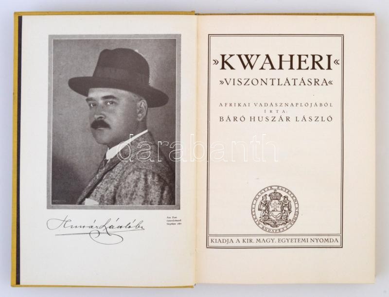 Báró Huszár László: Kwaheri. Viszontlátásra. Budapest, é.n. , Királyi Magyar Egyetemi Nyomda, 299 p. +1 kihajtható térkép. Kiadói egészvászon borító, fekete-fehér és színes képekkel illusztrálva. Jó állapotban.