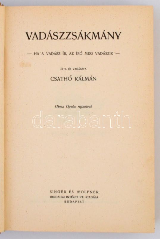 Csathó Kálmán: Vadászzsákmány. - Ha a vadász Ãr, az Ãró meg vadászik. ... https://www.darabanth.com/de/281-Fernauktion/281.0/Bucher/Bucher-Jagd~36/Csatho-Kalman-Vadaszzsakmany--Ha-a-vadasz-ir-az-iro-meg-vadaszik--Hincz-Gyula-rajza~II1448463