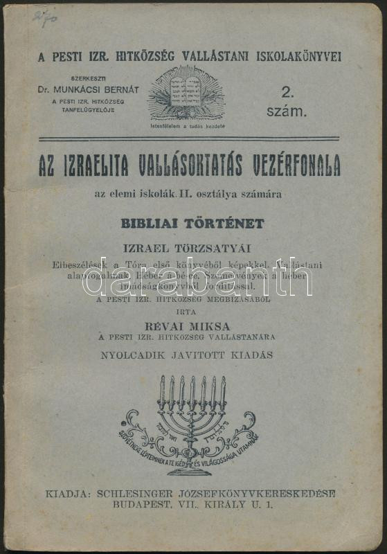 Révai Miksa: Az izraelita vallásoktatás vezérfonala az elemi iskolák II. évfolyama számára. Nyolcadik, javított kiadás, cca 1905, kiadja Schlesinger József könyvkereskedése Budapesten. A Pesti Izr. Hitközség pecsétjével, színes és FF illusztrációkkal