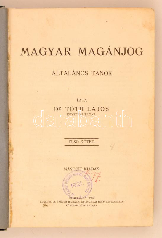 dr. Tóth Lajos: Magyar magánjog - Általános tanok Debrecen, 1922. Félv... https://www.darabanth.com/de/281-Fernauktion/281.0/Bucher/Bucher-Justiz~31/dr-Toth-Lajos-Magyar-maganjog--Altalanos-tanok-Debrecen-1922-Felvaszon-kotesben-ceruzC3~II1448850