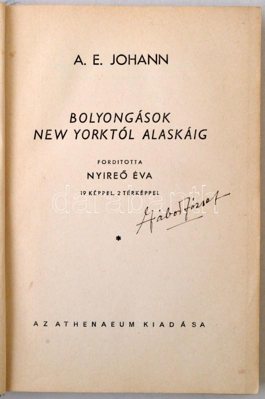 A. E. Johann: Bolyongások New-Yorktól Alaszkáig. Fordította: Nyíreő Éva. Ismeretlen világok. Bp., é.n., Athenaeum, 256 p. Kiadói aranyozott egészvászon kötésben. Fekete fehér képekkel, térképekkel illusztrálva. Némileg viseltes állapotban. A borítója fakó, a gerince és a kötése sérült.