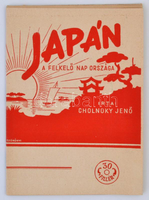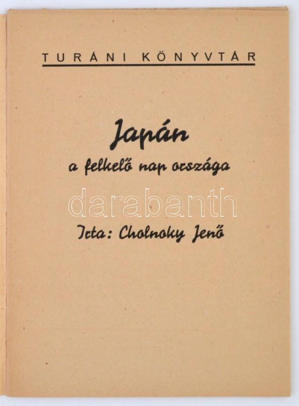 Cholnoky Jenő: Japán, a felkelő nap országa (Turáni Könyvtár). A Turáni Társaság kiadása, Budapest. Papírkötés Szörényi szignós grafikával, néhány képpel és térképpel, 32 p.