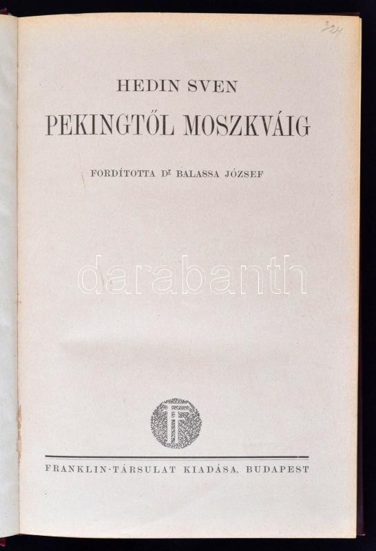 Sven Hedin: Pekingtől Moszkváig. Fordította: Dr. Balassa József. Budapest, É.N., Franklin-Társulat. Kiadói fűzött egészvászon, 231 p. Szép állapotban.