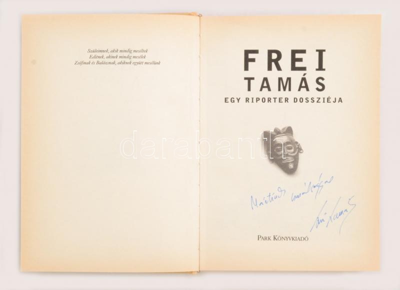 Frei Tamás: Egy riporter dossziéja. Budapest, 2001, Park Könyvkiadó. Kiadói kartonált papírkötés, a könyv egyik sarka sérült, javított. A szerző által dedikált példány.