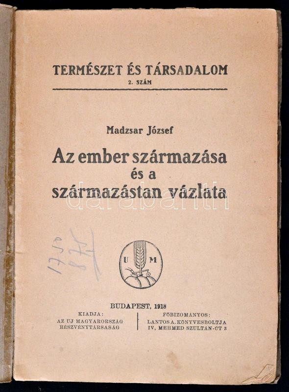 Madzsar József: Az ember származás és a származástan vázlata. Természet és Társadalom 2. Budapest, 1918, Új Magyarország Részvénytársaság, 95p. Kiadói papírkötés. A borítója szakadozott, a borítón és a címlapon ceruzás jegyzet.