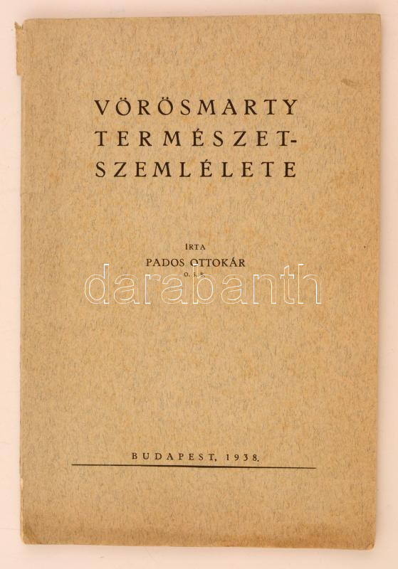 Pados Oszkár: Vörösmarty Természetszemlélete. Pannonhalmi füzetek 22. Budapest, 1938, Királyi Magyar Egyetemi Nyomda. Kiadói papírkötés, szakadt, hiányos gerinccel.