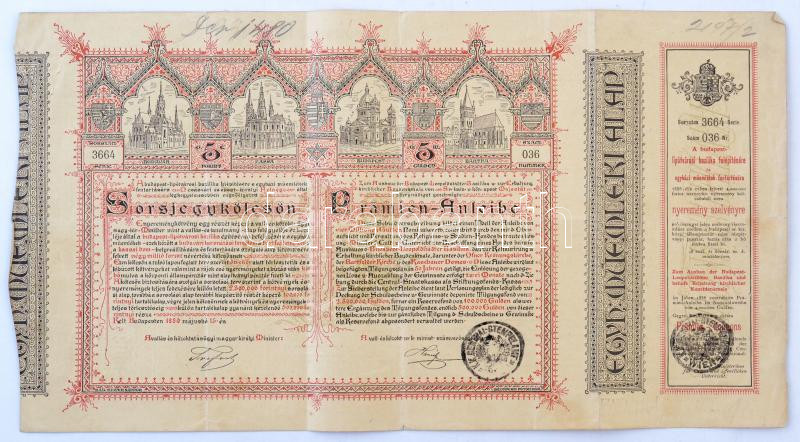 Budapest 1886. "Egyházi Műemlék Alap" sorsjegykölcsön 5Ft-ról a lipótvárosi bazilika felépítésére és egyházi műemlékek fenntartására, bélyegzéssel T:III