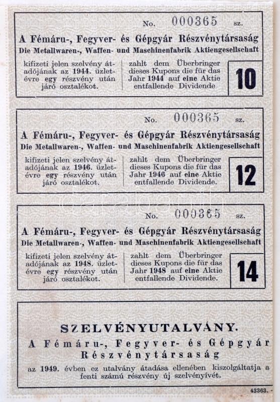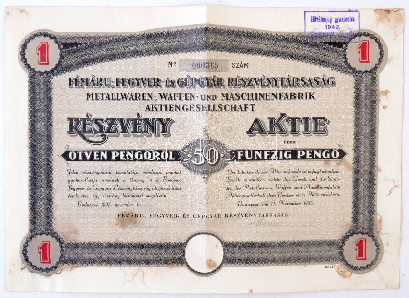 Budapest 1935. "Fémáru-, Fegyver és Gépgyár Részvénytársaság"... https://www.darabanth.com/de/281-Fernauktion/281.0/Numismatik/Aktien-und-Tickets~300005/Budapest-1935-Femaru--Fegyver-es-Gepgyar-Reszvenytarsasag-reszvenye-50P-rol-szelve~II1447777