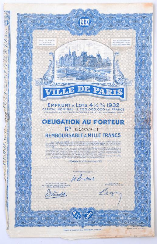 Franciaország / Párizs 1932. "Párizs városa 4 1/2%-os kötvénye" kötvény 1000Fr-ról, szelvényekkel T:III