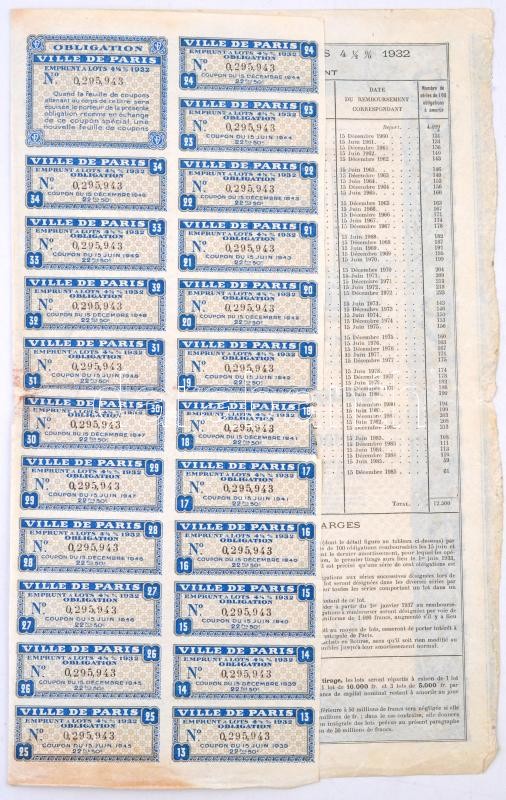 France / Paris 1932. "City of Paris 4 1/2% bond" bond about 1000 Francs with coupons C:F
