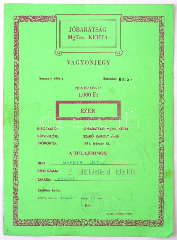 Kerta 1991. "Jóbarátság Mezőgazdasági Termelőszövetkezet" né... https://www.darabanth.com/de/281-Fernauktion/281.0/Numismatik/Aktien-und-Tickets~300005/Kerta-1991-Jobaratsag-Mezogazdasagi-Termeloszovetkezet-nevre-vagyonjegye-1000Ft-rol-T2-~II1449587