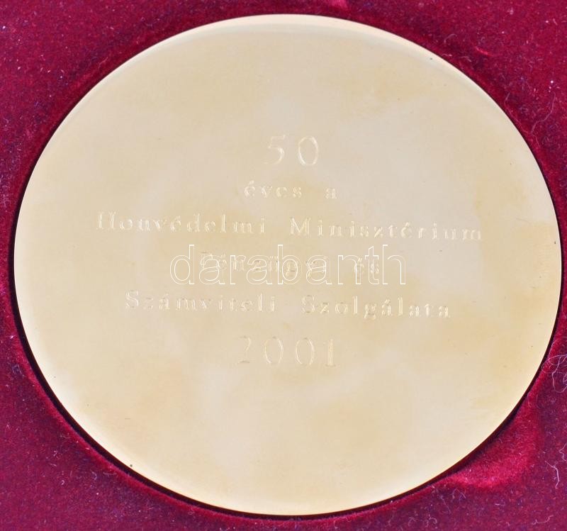 2001. "50 éves a Honvédelmi Minisztérium Pénzügyi és Számviteli Szolgálata 2001" aranyozott fém plakett, hátoldalon gravírozva, eredeti díszdobozban (90mm) T:1-
