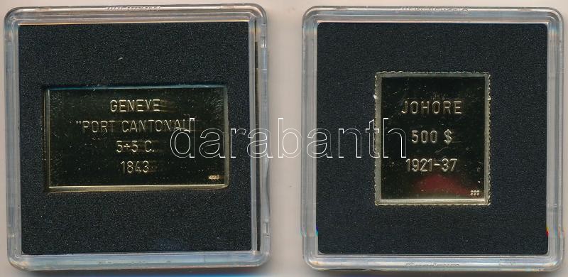 Beschreibung: DN "Világ Bélyegcsodái - Genf 5+5c 1843" aranyozott Cu bélyegérem tanúsítvánnyal (20,1x35mm) + DN "Világ Bélyegcsodái - Johore 500 Dollár 1921-37" aranyozott Cu bélyegérem (21,4x24,8mm) T:PP