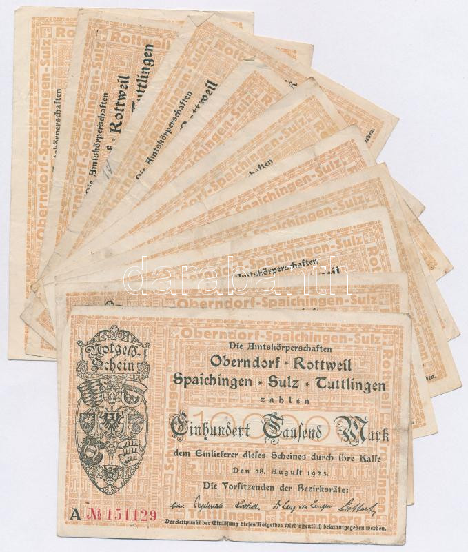 Németország / Weimari Köztársaság / Oberndorf, Rottweil, Spaichingen, Sulz, Tuttlingen 1923. 100.000M (10x) T:III Germany / Weimar Republic / Oberndorf, Rottweil, Spaichingen, Sulz, Tuttlingen 1923. 100.000 Marks (10x) C:F