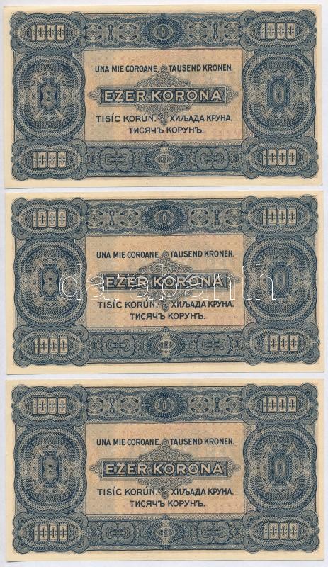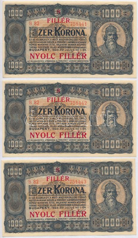 Beschreibung: 1923. 1000K "8 FILLÉR - NYOLC FILLÉR" felülnyomással (3x) sorszámkövetők T:I egyiken tűly.