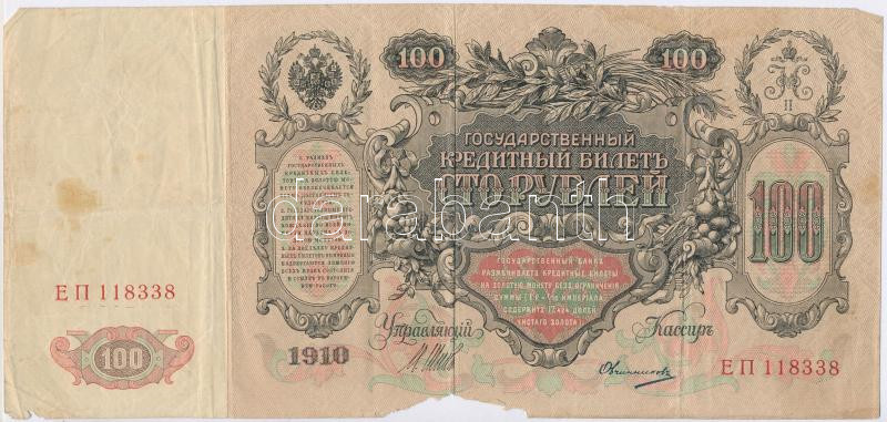Russian Empire 1909-1912. (1905) 3 Rubles Sign.: Konshin + 1912-1917. (1898) 1 Ruble + (1909) 5 Rubles + (1910) 100 Rubles Sign.: Shipov C:F,G 100 Rubles with material flaw