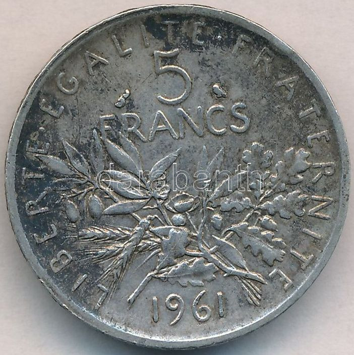K... https://www.darabanth.com/de/281-Fernauktion/281.0/Numismatik/Weltweit-Munzen~300013/Franciaorszag-1961-5Fr-Ag-T2-2-France-1961-5-Francs-Ag-CXF-VF---Krause-KM23926~II1438389