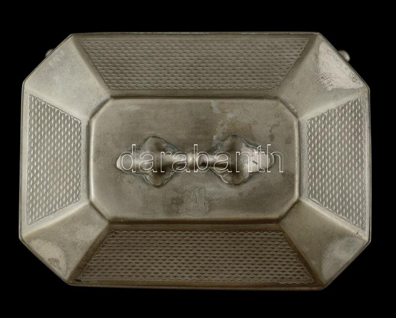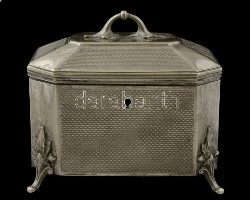 Beschreibung: Alpakka cukordoboz, kulcs nélkül, gravírozott címerrel, m:11 cm, 10×13 cm