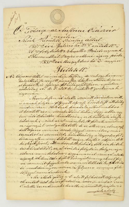 Beschreibung: 1851 Ítéletlevél, magyar nyelven, 2×30 kr szignettával