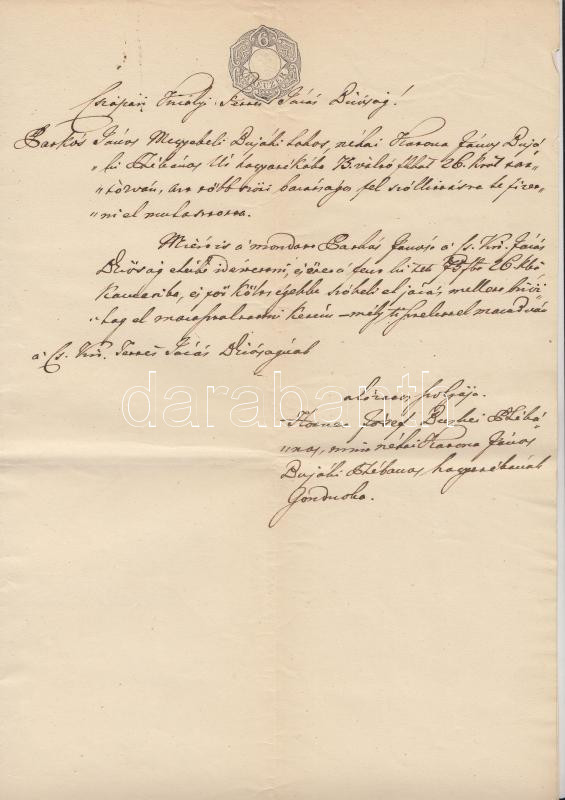 1854 Magyar nyelvű járásbírósági keresetlevél, 6 kr szignettával https://www.darabanth.com/de/282-Fernauktion/282.0/Andere-Sammelgebiete/Dokument~25/1854-Magyar-nyelvu-jarasbirosagi-keresetlevel-6-kr-szignettaval~II1458122