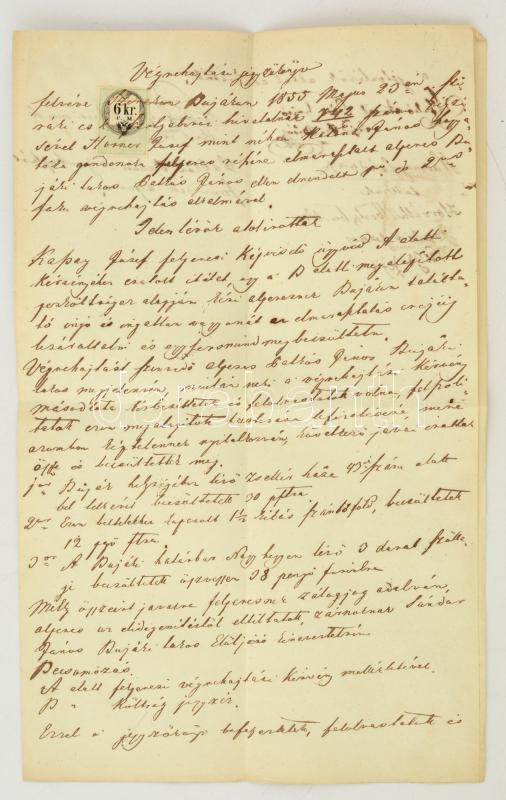 Beschreibung: 1855 Magyar nyelvű, kézzel írt végrehajtási jegyzőkönyv, 6 kr okmánybélyeggel