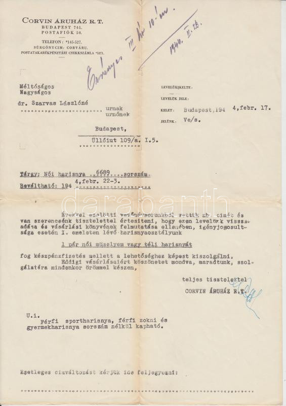 1944 Bp., A Corvin Áruház R.T. által kiküldött harisnyavásárlási utalv... https://www.darabanth.com/de/282-Fernauktion/282.0/Andere-Sammelgebiete/Dokument~25/1944-Bp-A-Corvin-Aruhaz-RT-altal-kikuldott-harisnyavasarlasi-utalvany~II1458550