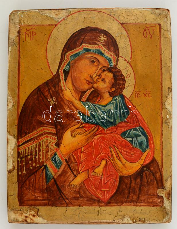 Jelzés nélkül: Istenanya gyermekével, a dečani kolostor ikonjáról készült modern másolat, tojástempera, vászon-fa, hátulján feliratozva, hitelesítő pecséttel, szélein sérült, 25×19 cm