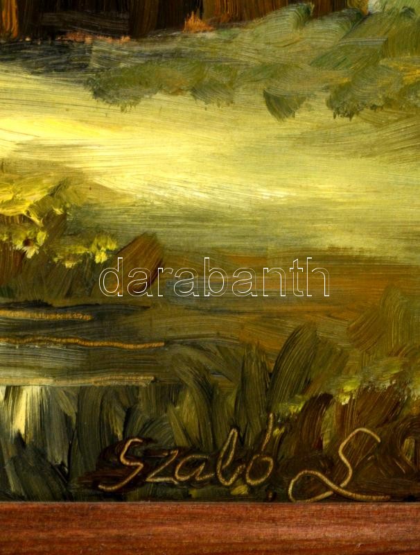 Beschreibung: Szabó László (?- ): Szalafő, Pityerszer 1. sz. porta 1993, olaj, farost, jelzett, keretben, 38×57 cm