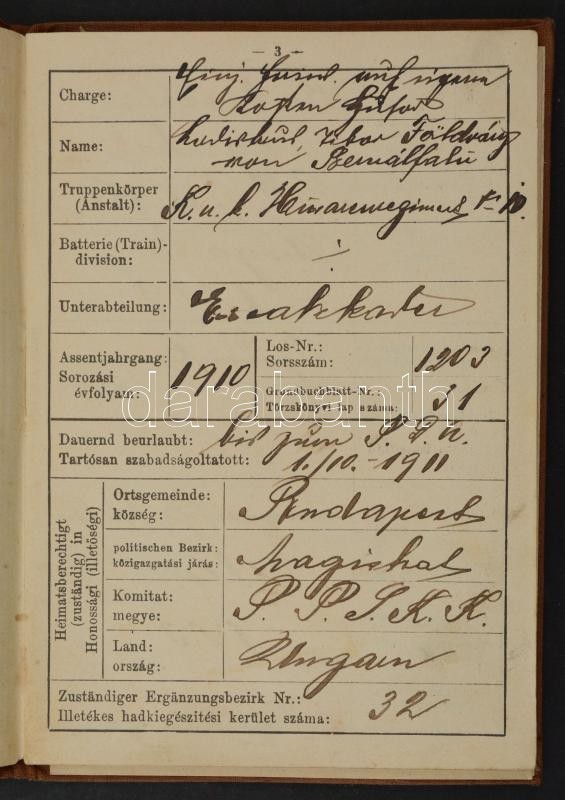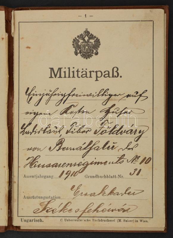 1911 Militärpass - Katonakönyv magyar huszárezredbeli katona részére. https://www.darabanth.com/de/282-Fernauktion/282.0/Andere-Sammelgebiete/Militaria~5/1911-Militarpass--Katonakonyv-magyar-huszarezredbeli-katona-reszere~II1455651