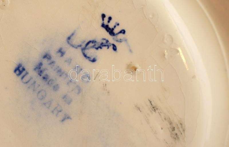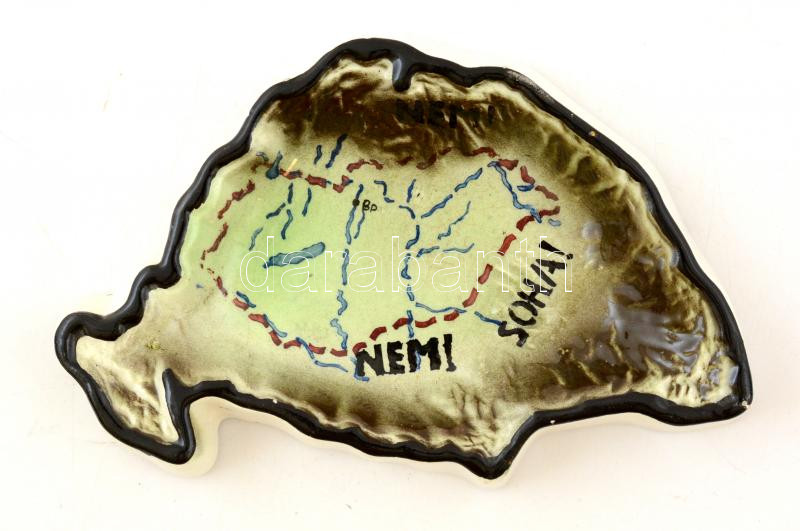 Beschreibung: Fischer Emil "Nem! nem! soha!" irredenta tálka a nagy Magyarország formájában, részben kézzel festett, jelzett, apró mázhibákkal, 18×10 cm