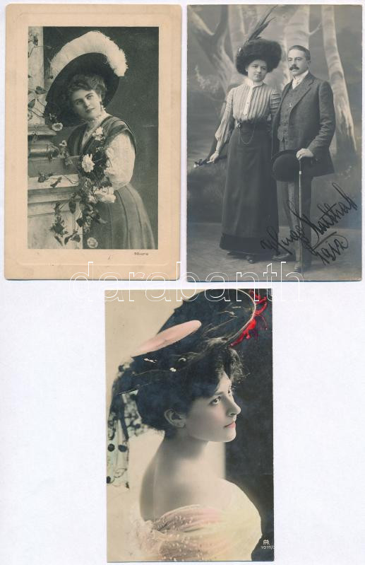 Beschreibung: 3 db RÉGI kalapos hölgyet ábrázoló képeslap, köztük 1 szignós fotóval / 3 pre-1945 postcards of ladies wearing hats, 1 signed photo
