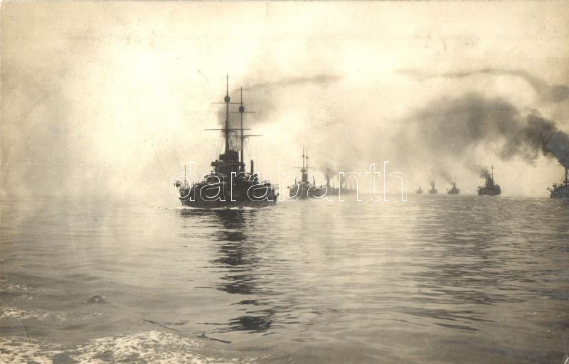 'Flotten-Manöver' / Osztrák-magyar haditengerészet flotta, előtérben egy Tegetthoff-osztályú csatahajó / Austro-Hungarian Navy fleet, Tegetthoff class battleship on the foregrund, photo Alois Beer (EK)