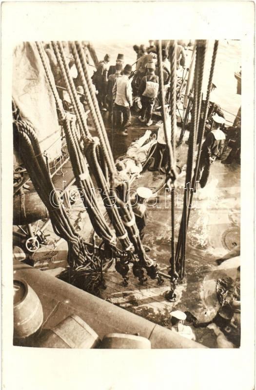 Sérült matróz és balkáni katonák osztrák-magyar hadihajó fedélzetén / ... https://www.darabanth.com/de/282-Fernauktion/282.0/Ansichtskarten/Kriegsschiffe~200099/Serult-matroz-es-balkani-katonak-osztrak-magyar-hadihajo-fedelzeten-Injured-mariner-and-~II1460154