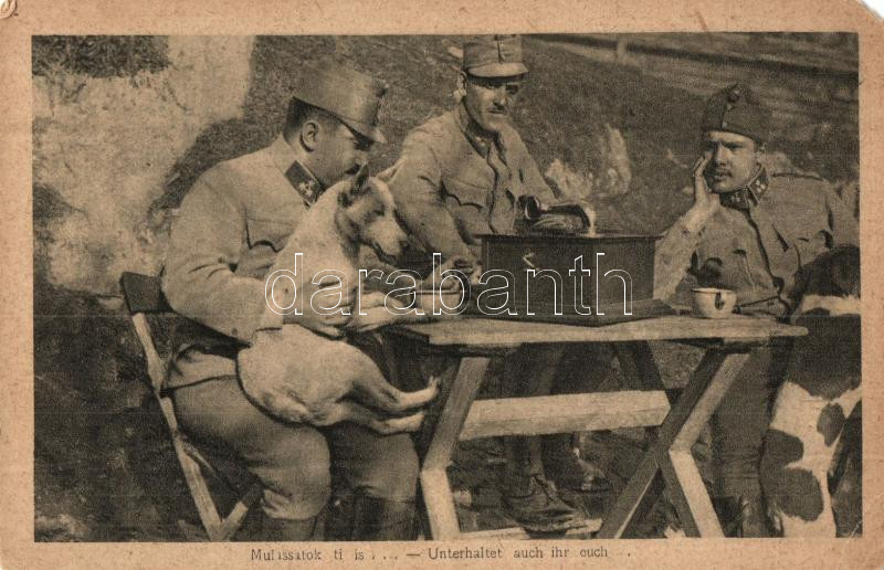 3 db RÉGI katonai csoportképes képeslap, ebből 2 fotó, vegyes minőségben / 3 pre-1945 military postcards, group photos, gramophone; 2 photos, mixed quality