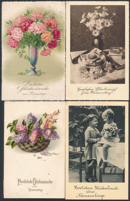 Beschreibung: Kb. 100 db RÉGI virágos névnapi üdvözlőlap, több litho lap, vegyes minőség / Cca. 100 pre-1945 Name Day greeting cards, some litho, mixed quality