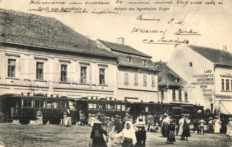Szentágota, Agnetheln, Agnita; Városi vasúti vonat indulása, Mayfarth & Co. üzlete, kiadja Wilhelm Fernengel / departure of the urban railway's train, shop (EK)