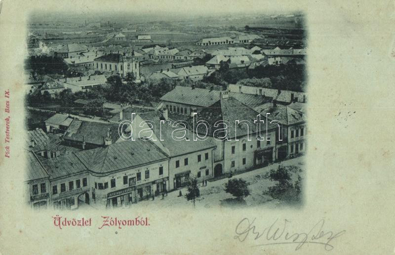 Beschreibung: Zólyom, Zvolen; látkép Hungária szállodával és Steiner Lajos és Henzel Pál üzletével / hotel and shops (Rb)