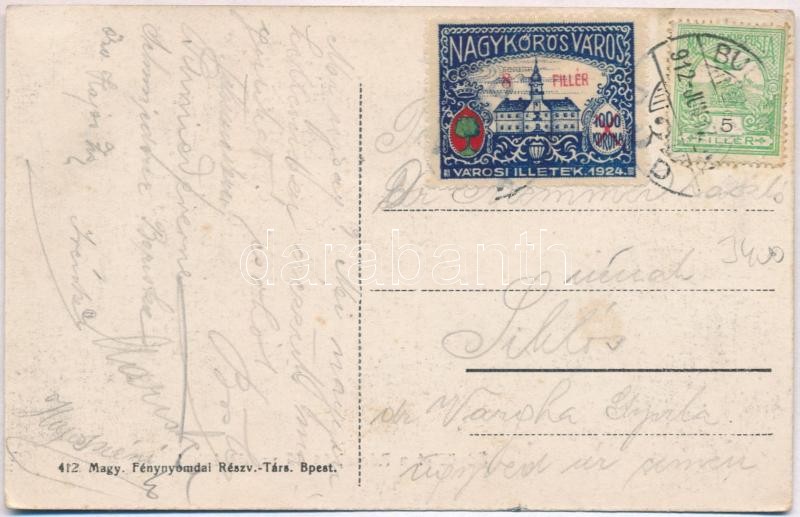 Beschreibung: Budapest III. Római fürdő vendéglő és kerthelyisége "Nagykőrös Város Városi Illeték" bélyeggel